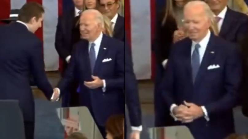Footage appears to show Barron and Biden grinning at one another as they lock hands, however, the 82-year-old’s expression dramatically changed a few seconds later.