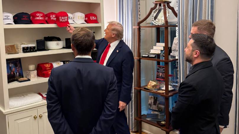 In an image shared on X by Special Assistant to the President Margo Martin, Trump can be seen showing France’s Emmanuel Macron, Zelenskyy and a third visitor the White House’s official Donald Trump merch stand.
